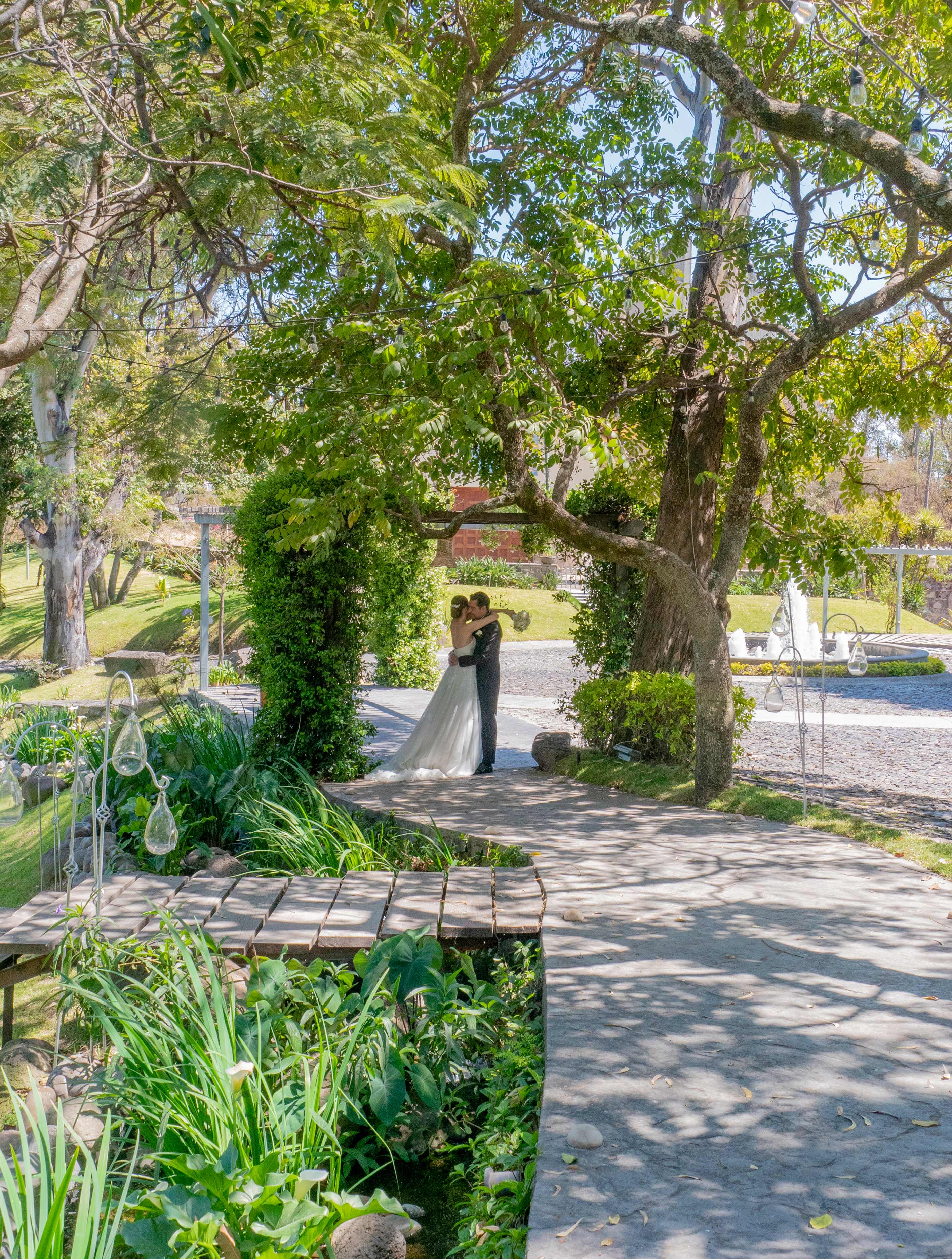 Los árboles centenarios forman una bóveda natural que protege cada promesa. La luz del día se filtra entre las hojas, los caminos de piedra guían cada paso, y el jardín se convierte en testigo silencioso de su historia de amor.